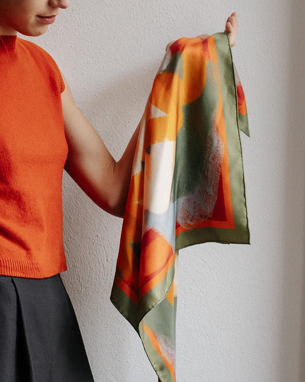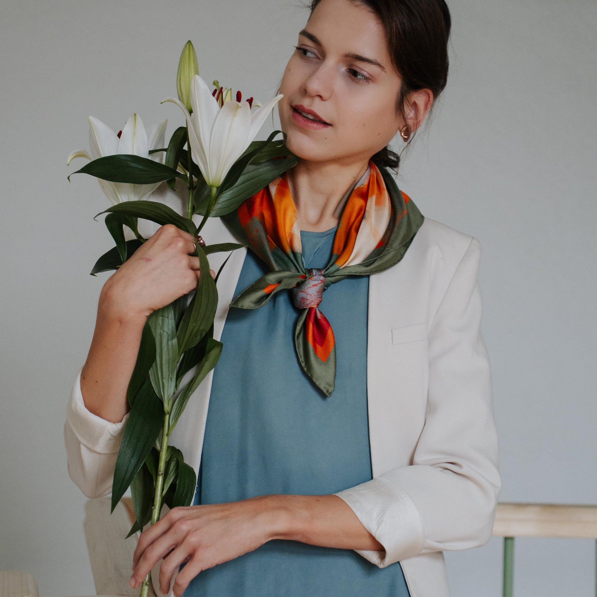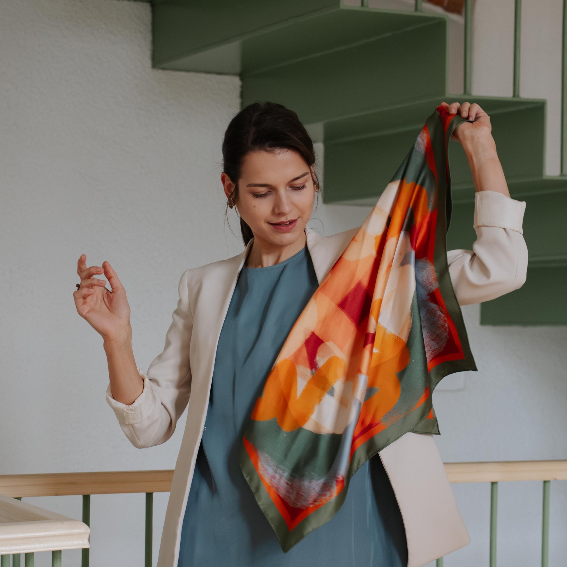A 65×65 cm-es méretnek köszönhetően sokoldalúan viselhető: fejkendőként, nyakban, csuklón vagy akár táskára kötve. Egy időtlen, karakteres kiegészítő, amely bármely öltözéket különlegessé tesz.
