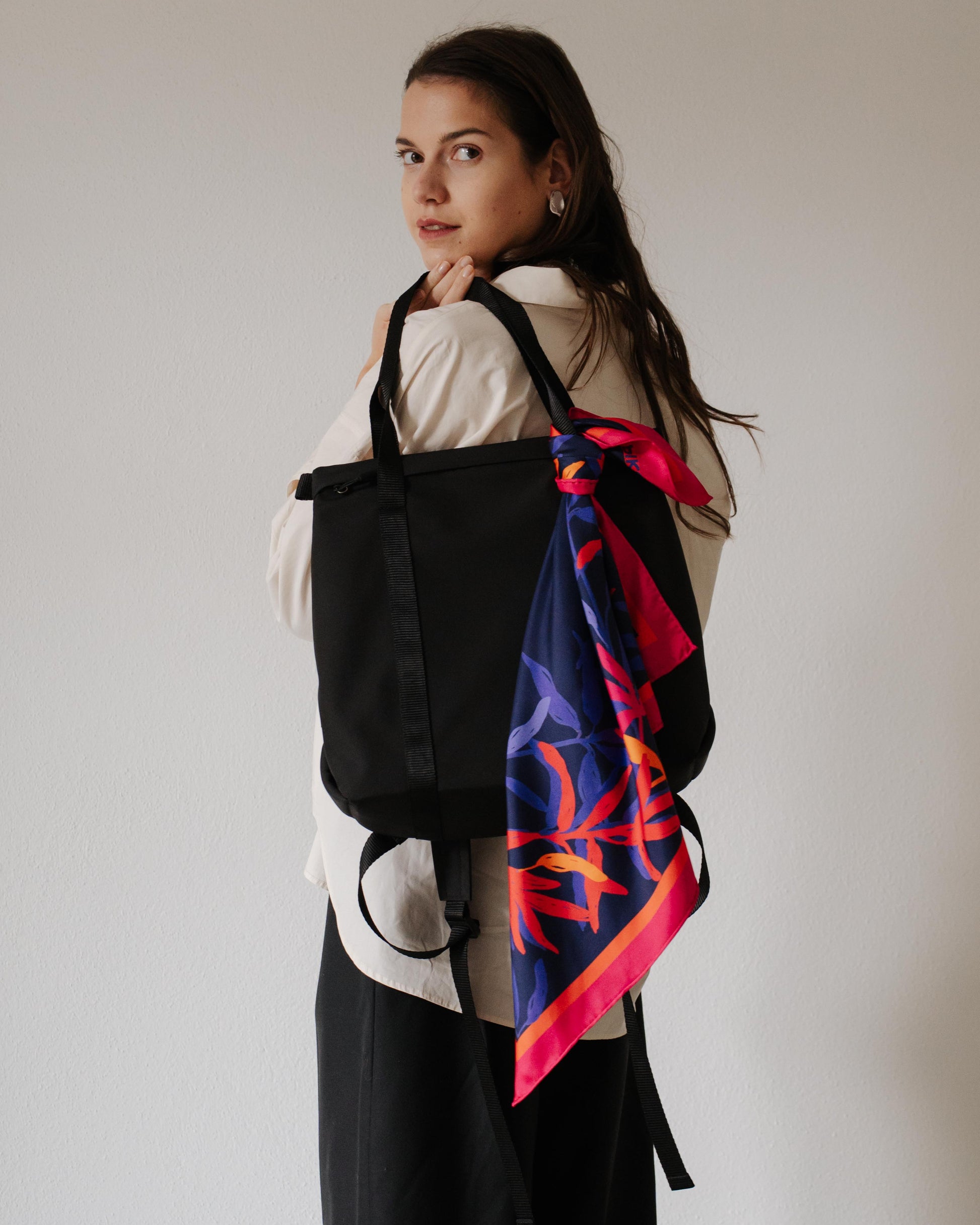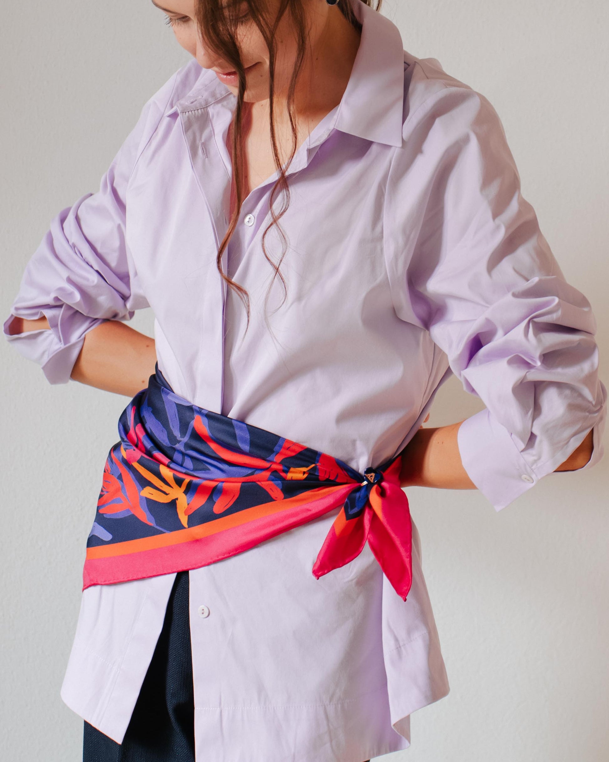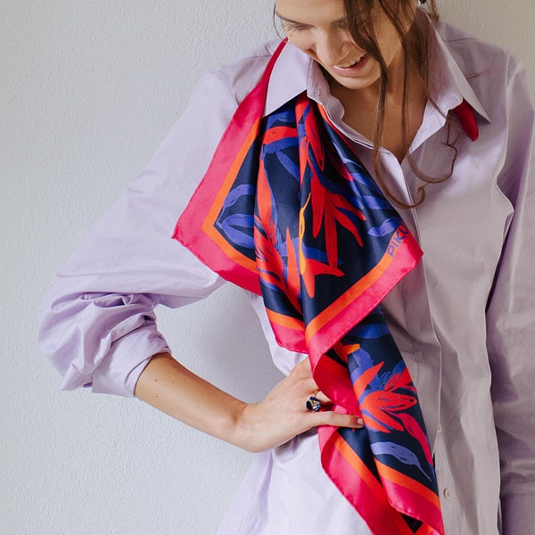 A 65×65 cm-es méretnek köszönhetően sokoldalúan viselhető: fejkendőként, nyakban, csuklón vagy akár táskára kötve. Egy időtlen, karakteres kiegészítő, amely bármely öltözéket különlegessé tesz.