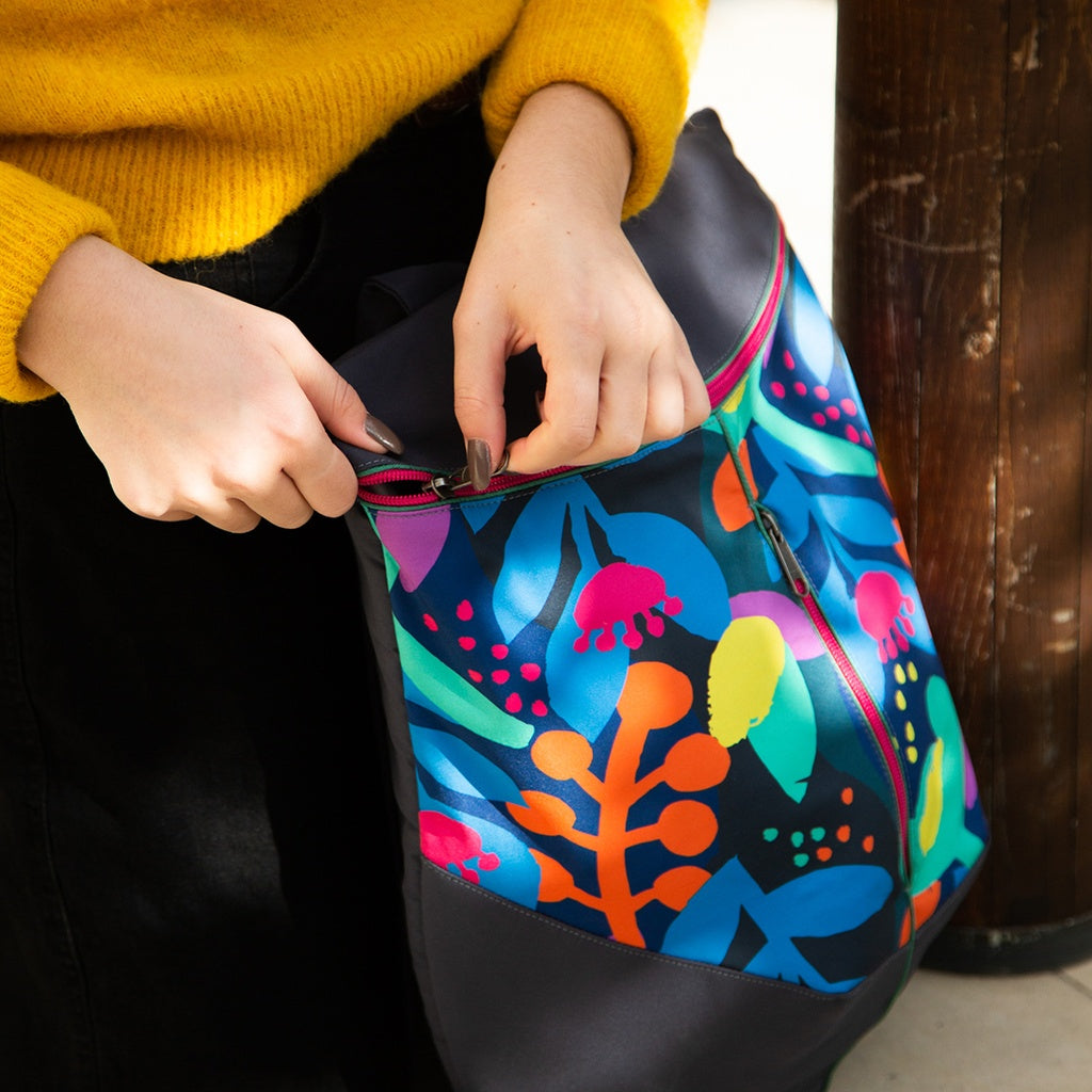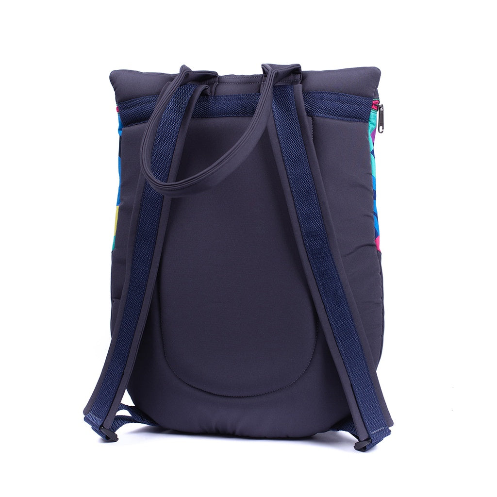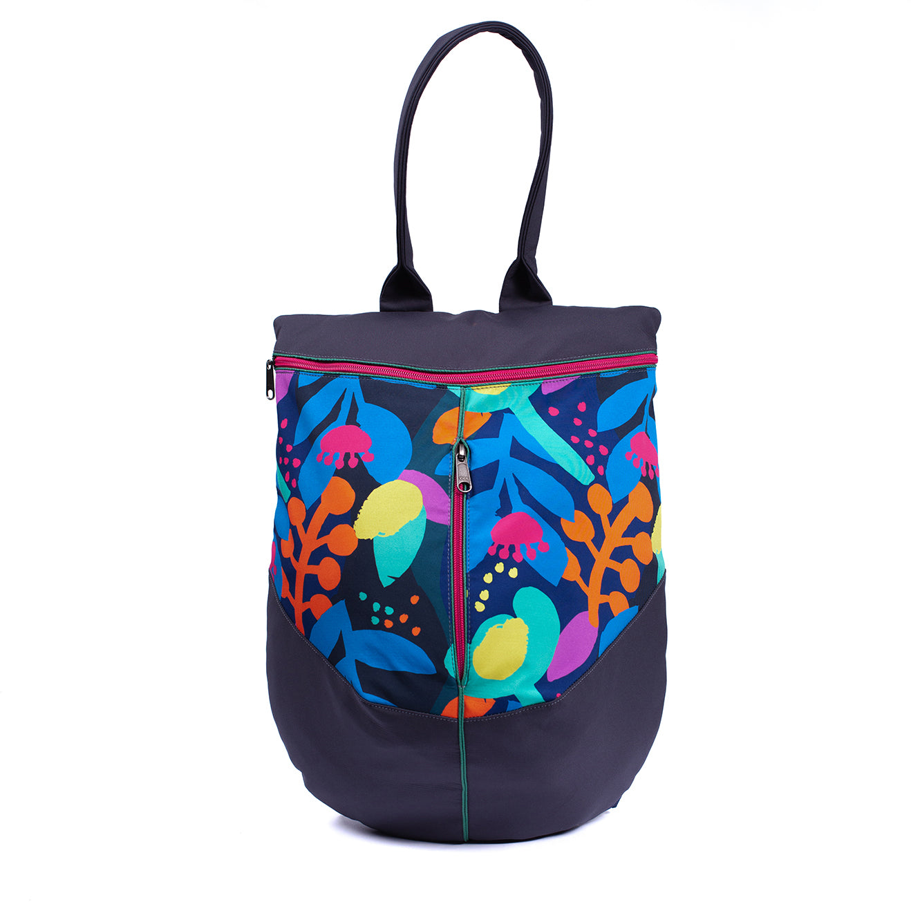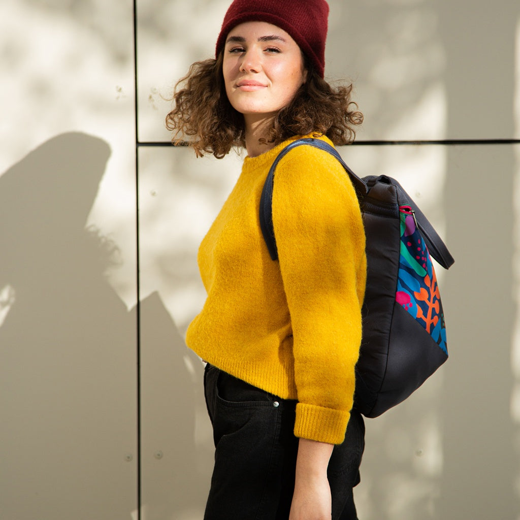 This backpack fits everything you might need during a busy day. Its distinctive shape and vibrant colors are sure to turn heads wherever you go. Thanks to the long handle, it can be carried as a shoulder bag or worn comfortably as a traditional backpack.