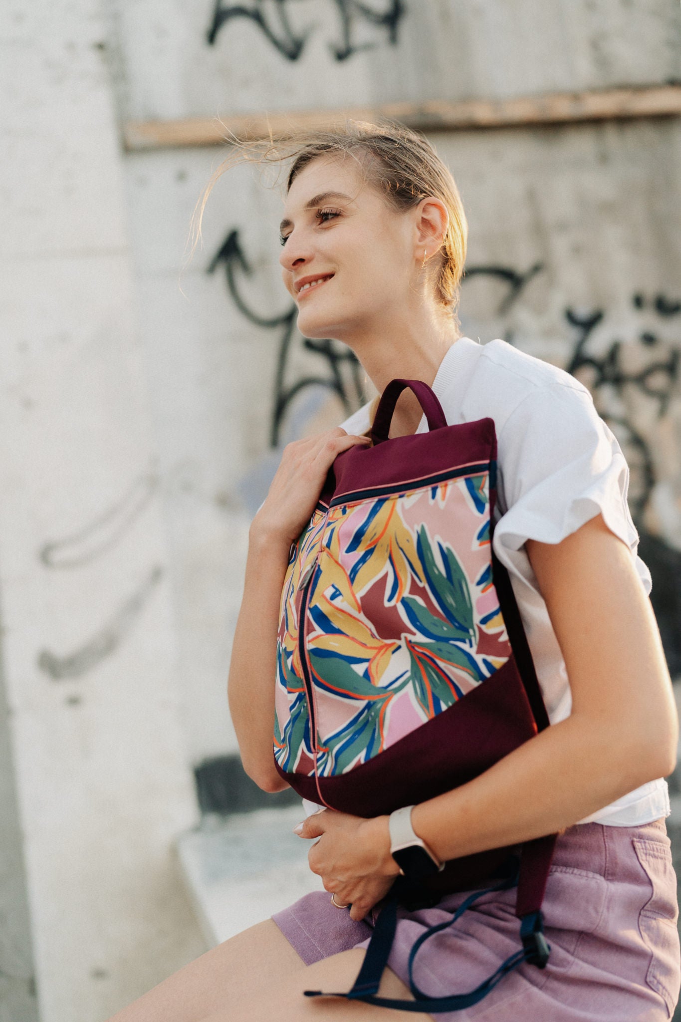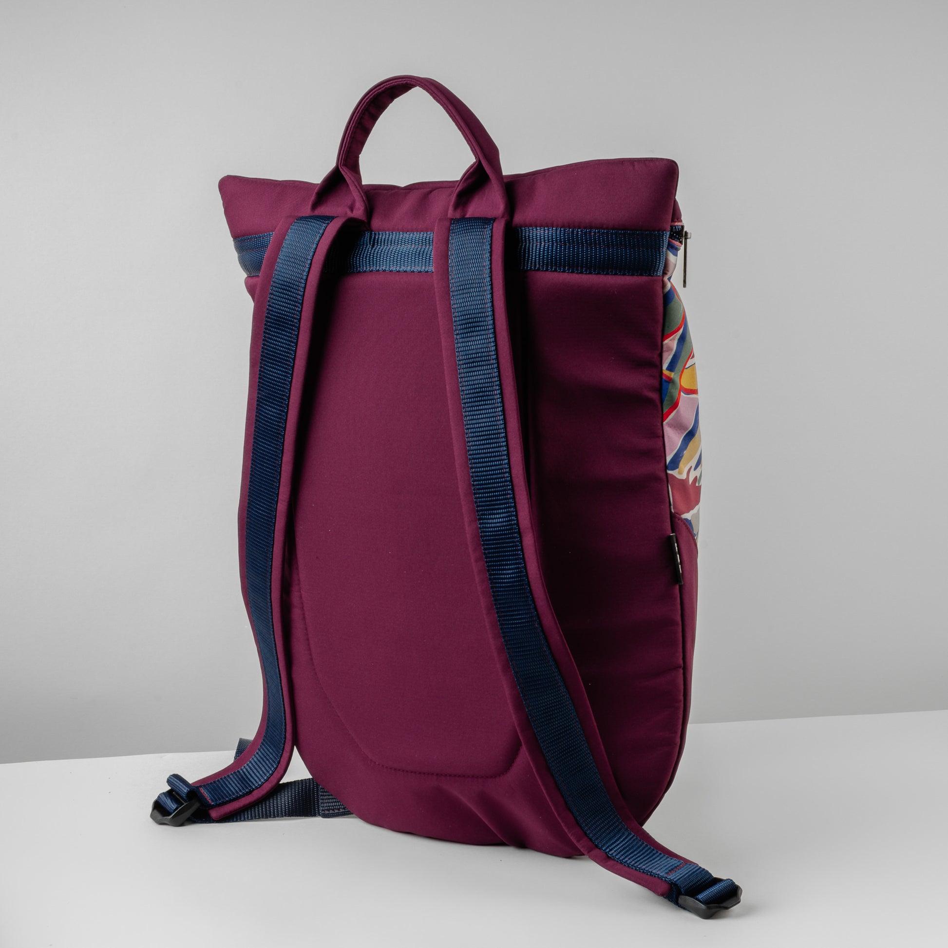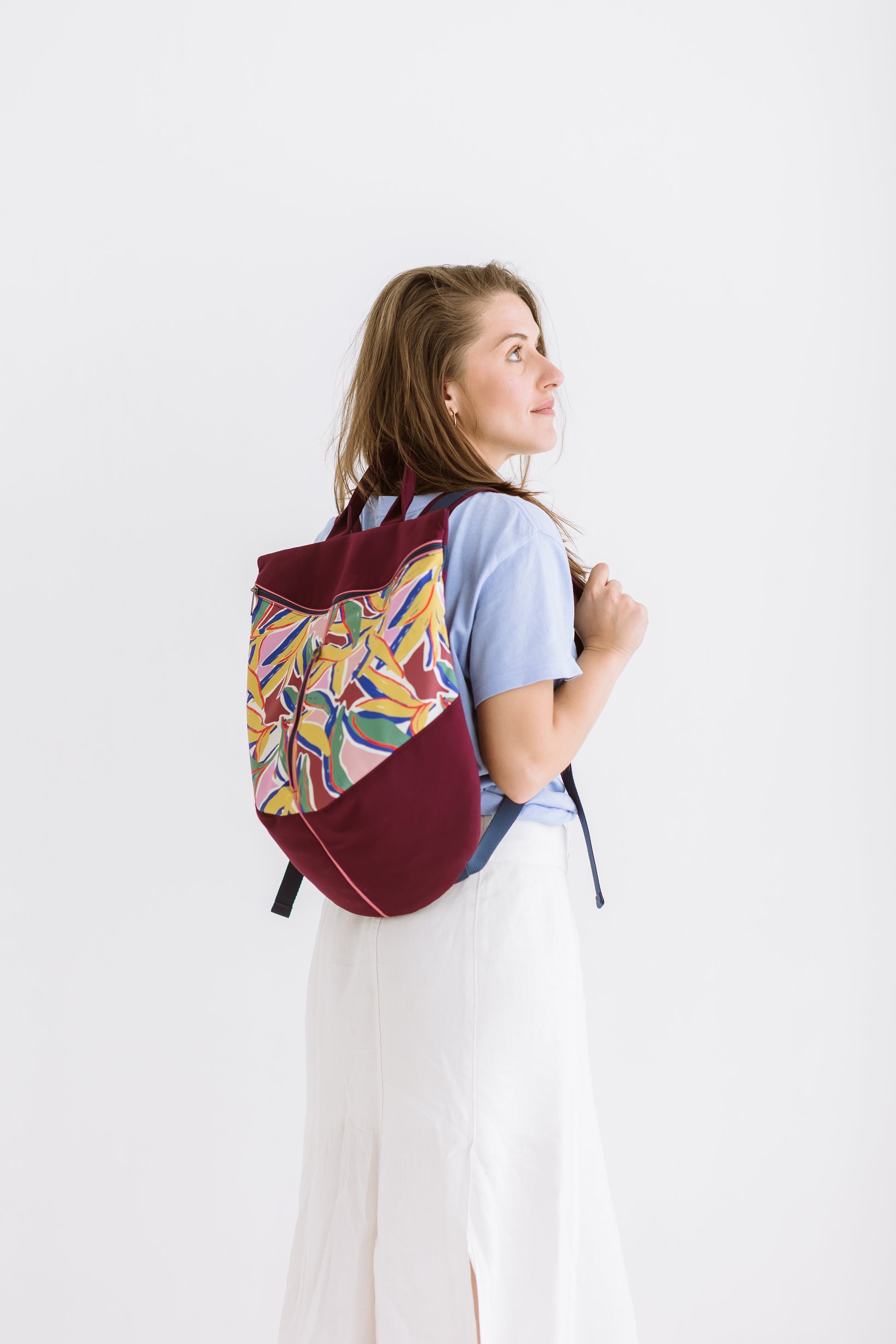 This backpack fits everything you might need during a busy day. Its distinctive shape and vibrant colors are sure to turn heads wherever you go.