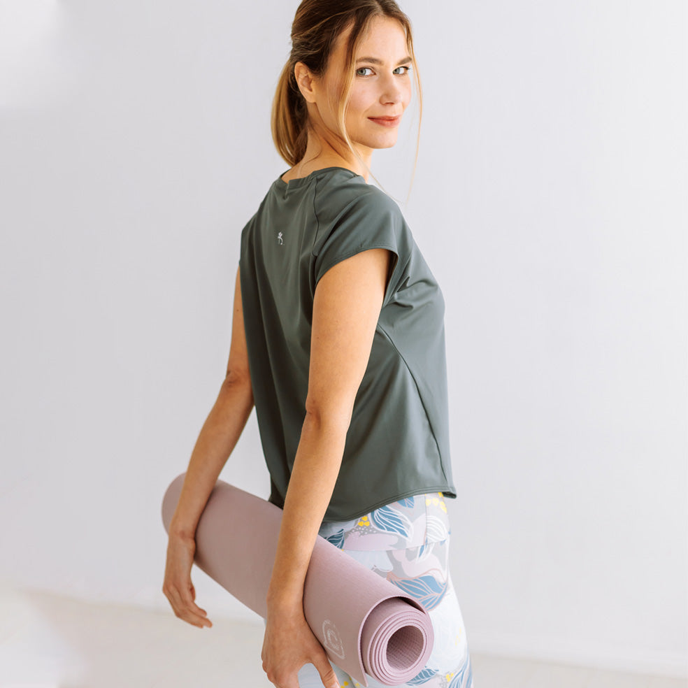 This short-sleeved fitness tee offers a relaxed fit that gently follows your body’s shape while allowing maximum movement. Its flattering design visually slims the waist, making it both functional and stylish. Perfect for any activity that requires flexibility and comfort.